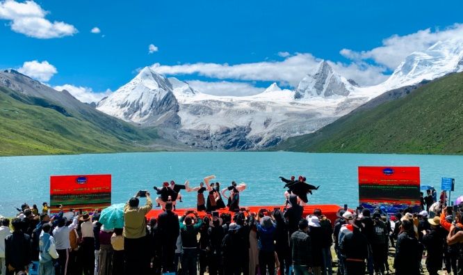 天高地闊,白云祥和,雪山巍然;清風(fēng)徐徐,青草依依,湖水湛藍(lán)。薩普雪山融水匯聚成一條清澈的河,從眼前激流直下。7月15日上午,一場別具特色的文化旅游賽事活動在這里拉開序幕。一場慷慨激昂、內(nèi)容豐富的主題推介演講,一首首悠揚(yáng)高亢、直擊心靈的民族歌曲,一幕幕輕盈靈動、鏗鏘有力的特色舞姿,引得現(xiàn)場數(shù)百名觀眾一陣陣掌聲雷動和直播間數(shù)十萬用戶點(diǎn)贊、好評不斷,成功向區(qū)內(nèi)外推介了比如縣得天獨(dú)厚的旅游資源和特產(chǎn)資源,為旅游事業(yè)和經(jīng)濟(jì)社會高質(zhì)量夯實了宣傳工作基礎(chǔ)。
